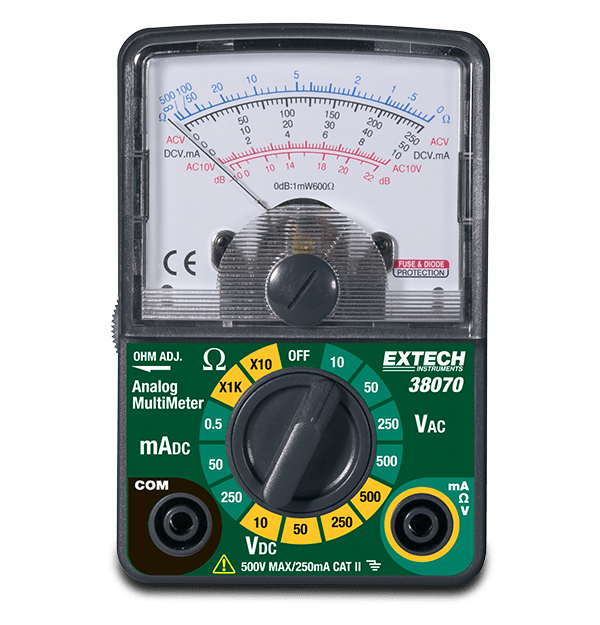 Extech’s 38070 Compact Analog MultiMeter offers the testing advantages of an analog meter with a pocket-friendly size and detachable leads. This compact and affordable multimeter is equipped with measurement capabilities that are ideal for the hobbyist, handyman, electronics tinkerer, or DIYer. Use this meter to perform basic troubleshooting on anything connected to an outlet. Analog meters like this one are also useful for illustrating adjustments made to a circuit between relative high and low settings. Includes test leads, one AA battery, and a user manual.