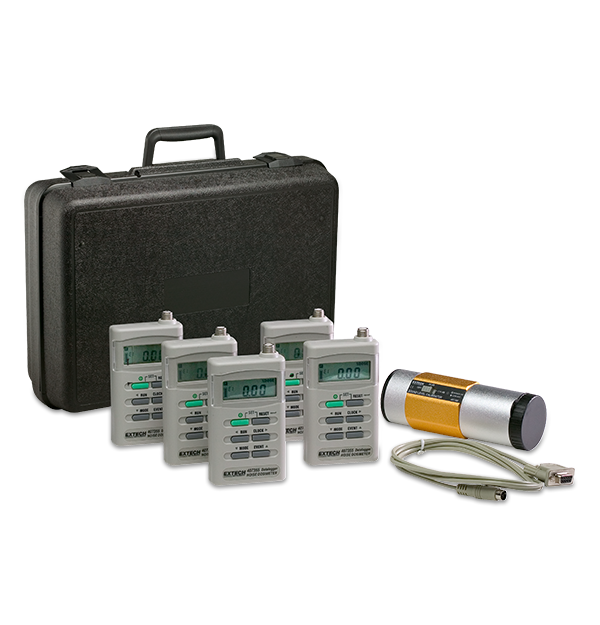 The Extech 407355-KIT-5 is a Noise Dosimeter/Datalogger Kit which includes five 407355 Noise Dosimeters with microphones, serial cable, and PC software. Also included is the 407766 94 db /114 dB Sound Calibrator and a hard carrying case made to hold all included products.