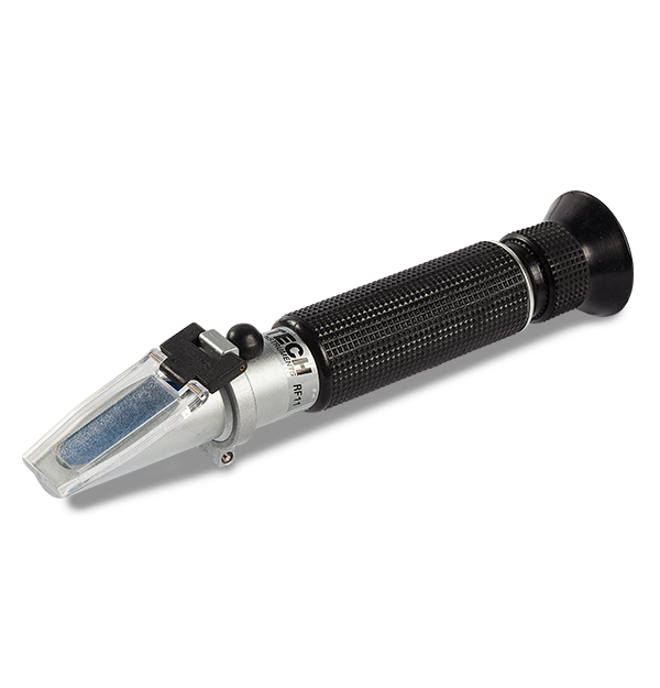 Das Extech RF11 ist ein Refraktometer zum Messen der Konzentration von Industrieflüssigkeiten und Zucker in Fruchtsaft. Es ist kompakt und einfach zu bedienen. Das RF11 benötigt nur 2 oder 3 Tropfen der Lösung und liefert präzise und wiederholbare Messungen auf einer leicht ablesbaren Skala. Prisma und Linse mit einfacher Fokuseinstellung und automatischer Temperaturkompensation von 10 °C bis 30 °C (50 °F bis 86 °F). Wird inkl. Gehäuse, Kalibrierschraubendreher, Kunststoffpipette und Kalibrierlösung geliefert.