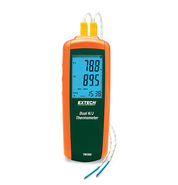 The Extech TM300 is a compact meter for differential temperature measurements. A large, backlit LCD displays T1, T2, and T1-T2 differential, plus min, max, and average values. It has a wide temperature range with 0.1°/1° resolution, and it has readout in °C, °F, or K (Kelvin). The data hold function freezes reading on display. It features an offset key used for zero function to make relative measurements, and an auto power off with disable feature. Complete with two general purpose Type K bead wire temperature probes, three AAA batteries, and pouch case.
