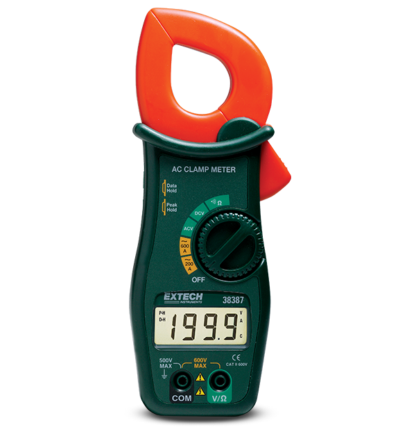 The Extech 38387 is a 600 A AC Clamp Meter which has a 3.2 cm (1.25 in) circular jaw for large cables up to 350 MCM. In addition to AC Current, it can measure AC/DC voltage, resistance, and has a continuity beeper. Meter features also include data hold and an auto power off. Product comes complete with test leads, 9 V battery, and a belt holster.