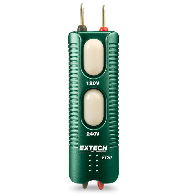 The Extech ET20 is a compact dual indicator Voltage Tester. 100 V to 250 V AC/DC volt detection. Probes snap on housing for easy, one-hand operation.