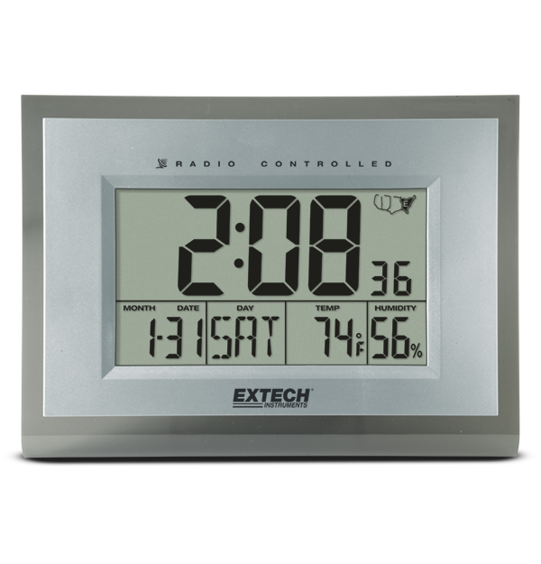 The 445706 is a large-digit desktop or wall-mount alarm clock with 5 languages. It measures temperature, humidity and has a Min/Max function. Calendar displays day, date, and month. Comes complete with desktop stand and 2 AA batteries.