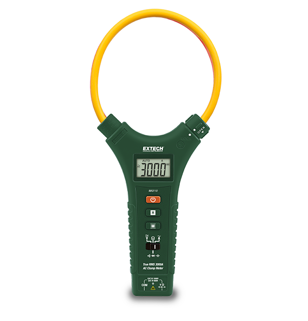 The Extech MA3110 is a 3000 A True RMS AC Flex Clamp Meter. The 28 cm (11 in) clamp jaw easily wraps around bus bars and cable bundles that may be difficult to access with regular clamp meters. The thin 8 mm cable diameter easily fits into tight spaces. Includes test leads for multimeter functions measuring voltage, resistance, and capacitance. The true RMS and CAT IV rated allows for maximum accuracy and safety for your measurements.