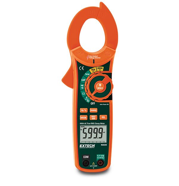 The Extech MA620 is a True RMS, autoranging AC Clamp Meter that offers plant maintenance techs, electrical troubleshooters, and DIYers a product with a high performance and exceptional value. In addition to a host of advanced multimeter and current measurement capabilities, it also has a built-in, non-contact (NCV) voltage detector. You can select auto or manual-ranging modes. The measurement functions cover all types of troubleshooting over and above noninvasive current probe measurements such as voltage, resistance, capacitance, frequency, duty cycle, diode, and continuity tests. Even measure temperature with the supplied Type K bead wire probe. Complete with test leads, general purpose Type K bead wire temperature probe, 9 V battery, and a carrying case.