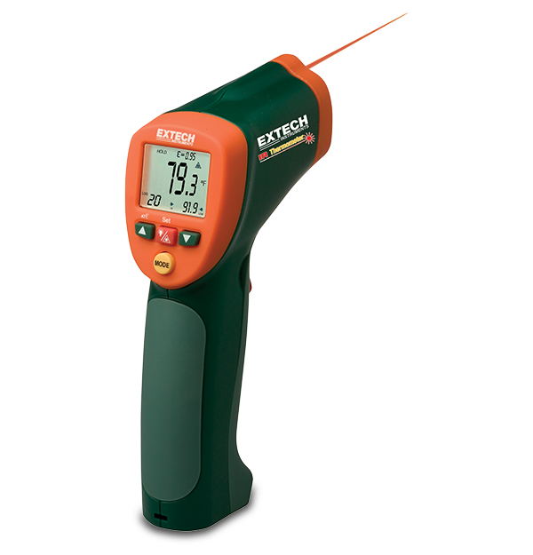 The Extech 42515 is a wide range InfraRed Thermometer with a Type K Input which measures both non-contact and contact temperature. It features a wide InfraRed temperature range from -50°C to 800°C (-58°F to 1472°F). Stores up to 20 readings. 13:1 distance to target ratio, laser pointer for easy targeting. Type K input for surface temperature measurements from -50°C to 1370°C (-58°F to 2498°F). Complete with a 9 Volt battery, Type K bead wire probe, and a case.