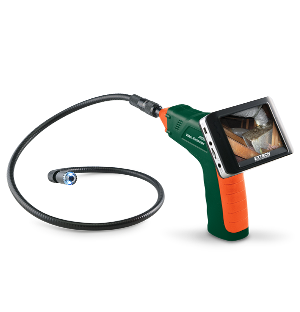 The Extech BR200 is a Video Borescope Inspection Camera with 17 mm camera diameter and a 8.9 cm (3.5 in) color TFT LCD Monitor. Ideal for home inspection, HVAC, automotive, industrial, aerospace, and security applications. It features a glare-free, close-up field of view and a detachable, wireless color display that can be viewed up to 8.9 m (32 ft) from measurement point. Complete with four AA batteries, microSD memory card with SD adapter, USB cable, extension tools (mirror, hook, magnet), video cable, AC Adapter (100 V - 240 V, 50 Hz/60 Hz), magnetic base stand, and a hard case.