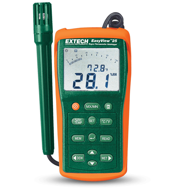 The Extech EA25 Hygro-Thermometer and Datalogger datalogs up to 15,000 records for PC download. Display any two parameters like temperature, humidity, dew point, or wet bulb simultaneously. The min/max function stores and recalls the highest and lowest readings, while also displaying the elapsed time to the minimum and maximum readings. The EA25 comes with a programmable auto power off, switchable °C/°F temperature units, and a data hold function that freezes readings on display. Complete with built-in stand, protective holster, probe with 1 m (39 in) coiled cable, software and optically isolated RS-232 cable, and 6 AAA batteries.