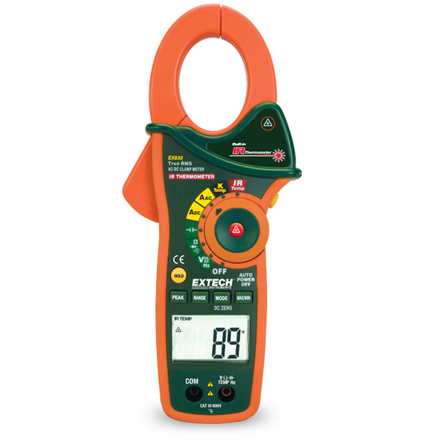 The EX830 clamp meter features a unique, built-in, non-contact Infrared thermometer with laser pointer to monitor temperature and locate hot spots on motors and electrical devices. A large 4000 count LCD display with bright back lighting allows you to see the reading in dim light. The ergonomically designed double-molded housing offers a better grip for one-hand operation. The 1.7" (43 mm) diameter jaw opening is large enough for conductors up to 750MCM. In addition to AC/DC current, it measures AC/DC voltage, resistance, temperature, capacitance, and frequency. It features: diode test, audible continuity beeper, min/max, data hold, auto power off, and a fast peak hold that captures inrush currents and transients. Comes complete with test leads, 9V battery, type K bead wire temperature probe (-4 to 482°F/-20 to 250°C) and a belt holster.