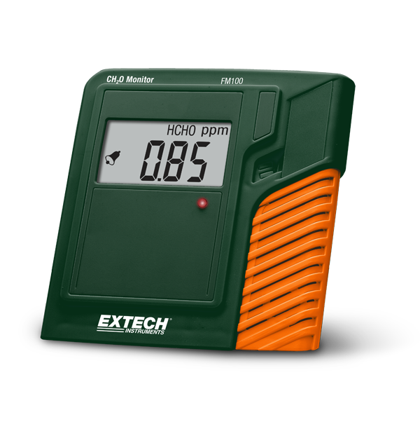 The Extech FM100 is an indoor compact Formaldehyde Monitor with a tilting leg stand. It alternately displays formaldehyde concentration, air temperature, and relative humidity readings which cycles approximately every 6 seconds. The FM100 features both audible and visual alarms, zero recalibration function, manual temperature and relative humidity compensation (adjustable), CH2O calibration function in fresh air, and a low battery indicator. Product is CE certified and has a one year warranty. Complete with universal AC adaptor (including US, EU, UK, and AU plugs), user's manual, and 4 AAA batteries.