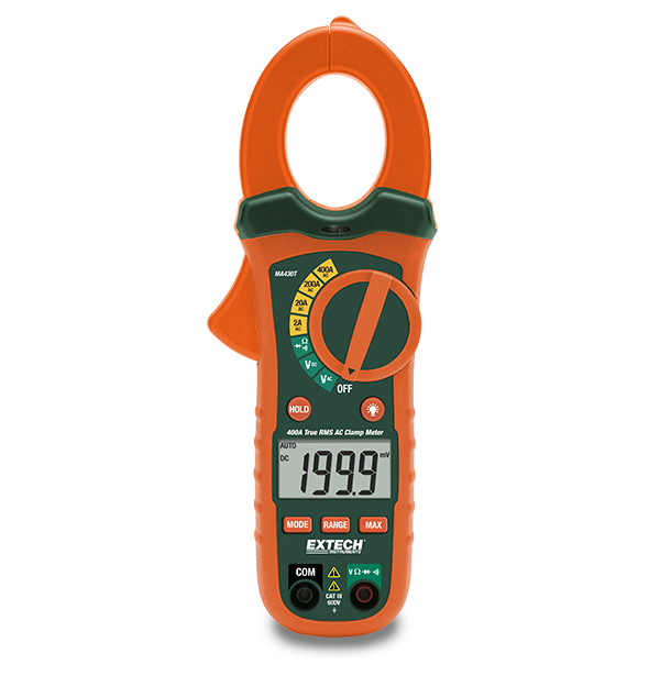 The Extech MA430T is a compact, 400 A AC Clamp Meter that enables users to take measurements in tight spaces. The 30 mm (1.2 in) jaw opening can accommodate conductors up to 350 MCM. Featuring a large, four digit readout, the illuminated display is easy to see in poorly lit work areas, and the thumb dial selector is ergonomically placed for convenient, one-hand operation. It also has True RMS for better accuracy when measuring distorted waveforms. The MA430T’s multimeter functions include AC/DC voltage, resistance, diode, and continuity. Also built into the MA430T is the non contact voltage (NCV) detector. Eliminating the need for a separate tester, the NCV detector uses a red LED to alert users to the presence of voltage on live wires. Additional features include data hold, auto power off, and low battery indication. Comes with test leads, 9 V battery, soft carrying case, and user manual.