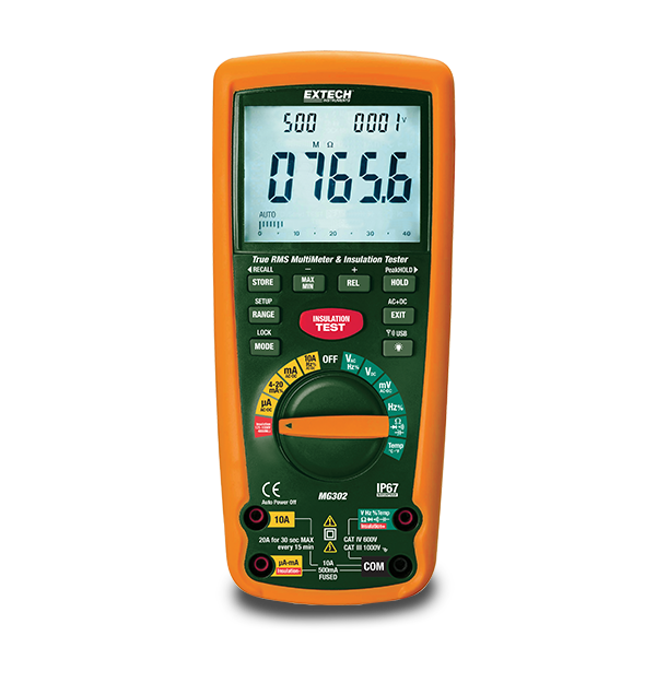 The Extech MG302 is a Wireless True RMS Multimeter with a built in insulation resistance tester. By adding insulation testing capabilities to this CAT IV-rated digital multimeter, electrical troubleshooters will always be equipped for the job. The digital insulation resistance tester, or megohmmeter, comes with four different test voltages for measuring resistance up to 4G Ω with 0.001 MΩ resolution. The multimeter also includes useful extras like duty cycle measurements, milliamp readings, and a built-in wireless data recording for safer troubleshooting and maintenance on moving equipment. The MG302 is waterproof (IP67-rated) and comes with a remote USB receiver, Windows compatible software, test leads with alligator clips, Type K bead wire temperature probe with adapter, carrying case, six AA batteries, and a user manual.