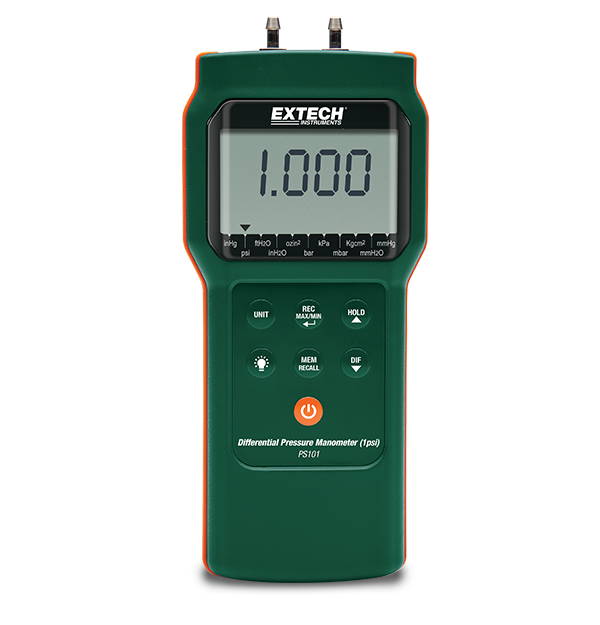 The Extech PS101 Differential Pressure Manometer is ideal for field, manufacturing, or lab/R&D use. It offers a 1 psi range, readings in 11 units, and high resolution. The manometer also features a large LCD display with backlighting, data hold, auto power off/disable, and a zero function for offset correction or measurement. This product is complete with 6 AAA batteries, two connection hoses, and a hard carrying case.