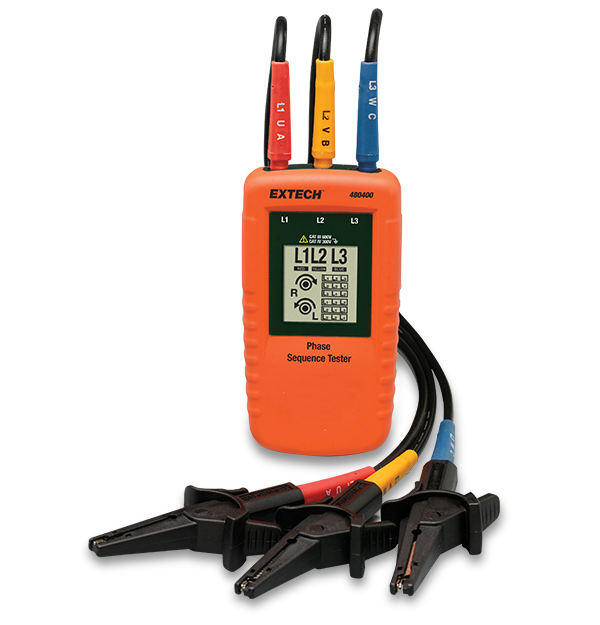 The 480400 Phase Sequence Tester has a 40 to 600-Volt rated range for testing phase orientation of 3-phase power sources over a 15 to 400Hz frequency range. Multiline graphical LCD indicates phase orientation (clockwise or counter-clockwise) and whether each of the phases is live. No battery required. Comes complete with cable, three large color coded alligator clips, and pouch case.