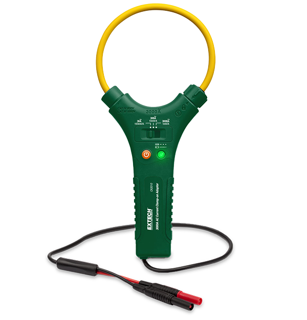 The Extech CA3010 is a 3000 A AC Flex Clamp-on Adaptor for multimeters and clamp on meters with standard sized banana plugs. The CA3010 is a 25.4 cm (10 in) flexible clamp capable of measuring AC currents up to 3000 A. Complete with built-in flex clamp cable, 2 m (6.6ft) lead with banana plugs, and two AAA batteries. UL listed with a CAT IV 600 V safety rating.