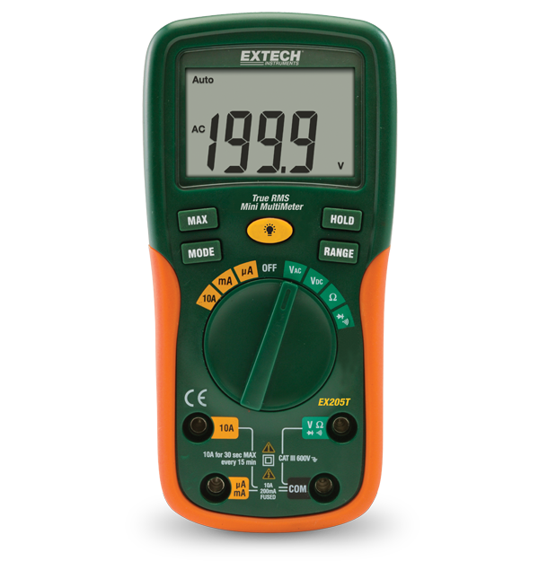 The Extech EX205T is a True RMS Digital Multimeter which provides true AC readings when measuring distorted or non-sinusoidal waveforms plus noisy signals. This model is also auto ranging, which means it automatically displays readings with the proper decimal place location and maximum resolution. Featuring a large 2000 count, backlit dual LCD with easy to read digits, this multimeter measures AC/DC voltage, resistance, diode test, and continuity. The meter also makes use of a number of functions including input fuse protection, max hold, auto power off, and data hold functions. Product includes test leads and 9 V battery.