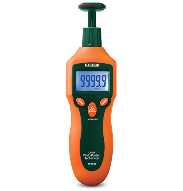 The Extech RPM33 provides both contact (2 to 19,999 rpm) and non-contact (2 to 99,999 rpm) revolutions per minute measurements for enhanced versatility. Safely record laser-guided non-contact RPM measurements from up to 500 mm (1.6 feet) away. The RPM33 displays on the large five-digit backlit LCD. Store and recall 10 data sets in memory with four parameters (measurement, max, min and average). The unit comes with contact wheel for linear surface speed 0 to 1999.9 meters/minute; 0.2 to 6560 feet/minute) or RPM measurements, 9-volt battery, reflective tape, carrying case, and user manual.