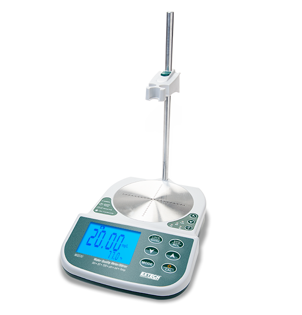 The Extech WQ530 is a 8 in 1 Benchtop Meter capable of measuring dissolved oxygen, concentration/saturation, pH, ORP, conductivity, TDS, salinity, and temperature of liquids and semi-solids. The unit features a 30 min, 60 min, and 120 min timer or continuous stirring. It also features two or three point pH calibration, one point conductivity calibration, automatic temperature compensation, adjustable conductivity to TDS ratio, and manual salinity and altitude compensation. The WQ530 features a large backlit dual display and the ability to store and recall 150 readings, as well as capture readings directly to a PC via the built-in USB interface. The WQ530 comes complete with pH glass electrode, conductivity cell, DO probe, temperature probe, four membrane caps and DO internal fill solution (30 mL), pH calibration solutions (4 pH and 7 pH), conductivity calibration solutions (1413 µS and 12.88 mS), plastic burette, polishing paper, electrode clamp and rod, software and USB cable, AC adapter and stirrer, and user manual.