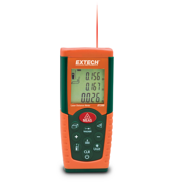 The Extech DT200 features a laser measurement accurate to 2mm (0.08 in) at 9.8 m (32 ft). It measures from 5 cm to 35 m (2 in to 115 ft). Historical Storage recalls the previous 10 records (measurements or calculations), and it automatically calculates area and volume. Continuous measurement function with min/max distance tracking updates every 5 seconds. It features addition/subtraction, front or rear edge reference, and indirect measurement using the Pythagorean Theorem. Includes a low battery indicator and auto power off function. Complete with carrying case and two AAA batteries.