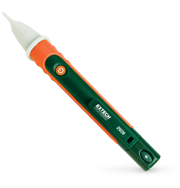 The DV26 is a non-contact voltage detector with a built-in flashlight. It detects AC voltage from 100 to 1000 VAC without contact and alerts the user with LED's and audible beeping. The DV26 is built in a rugged double molded housing, has a CAT III 1000 V/ CAT IV 600 Volt safety rating and is complete with a year warranty and two AAA batteries.