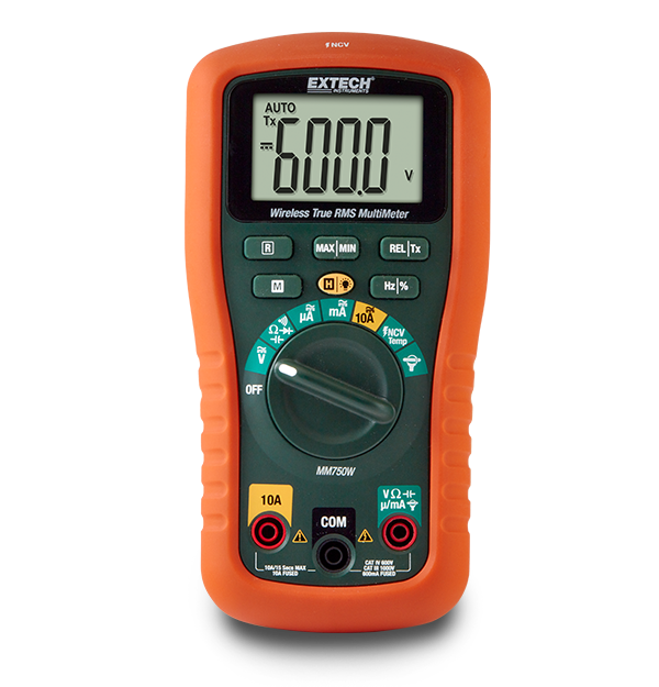 Extech’s MM750W is a fully loaded, rugged, Wireless Datalogging Multimeter with 14 functions. It includes non-contact AC voltage detection and Type-K temperature measurement. Using the wireless feature, Bluetooth® data logging module, and the free ExView® W-Series App, you can transmit readings in real-time to your smart devices, store over 15K readings for wireless transfer to generate a report/data analysis, add notes and readings to photos taken from your smart device camera, and use your smart device as a 2nd display for easy viewing or sharing. A smart meter that does not require a clipboard or notepad on the job.