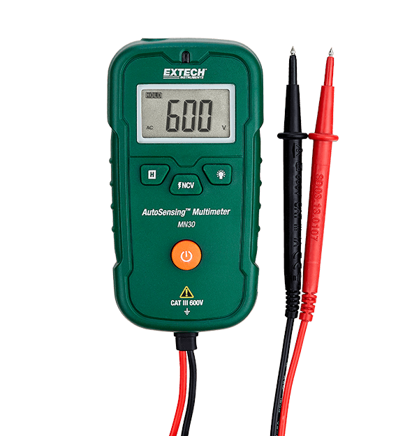 The Extech MN30 is a convenient pocket multimeter with an AutoSensing™ feature. The AutoSensing™ feature enables the meter to recognize inputs and automatically switch to the correct mode of operation (i.e. voltage to resistance measurements). The true RMS AC voltage measurement allows for accurate readings regardless of waveforms. The built in, non-contact voltage (NCV) detector allows for quick detection of live voltage. Convenient LED flashlight illuminates dimly lit area.