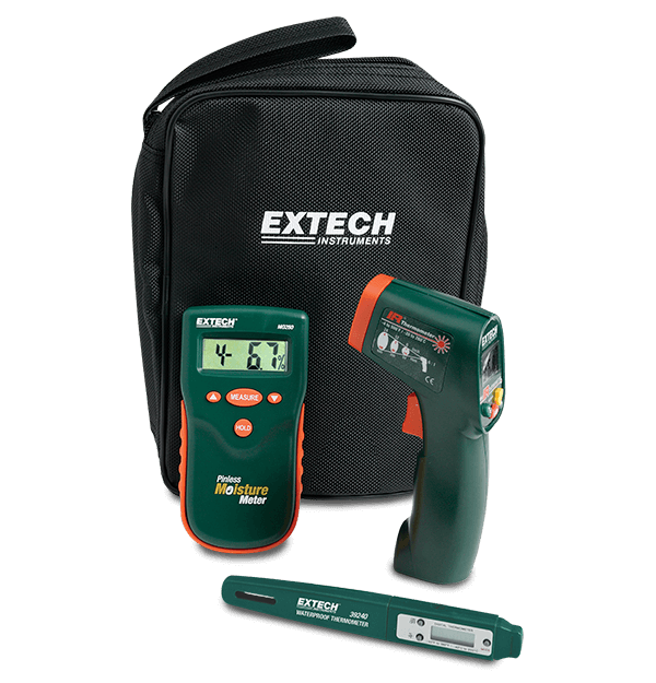 The Extech MO280-KH2 Professional Home Inspection Kit aids in the identification of moisture, HVAC, and electrical and hot water system issues. The kit includes a pinless moisture meter for non-invasive moisture detection, an infrared thermometer for non-contact surface measurements (from -20°C to 400°C or from -4°F to 752°F), and a waterproof stem thermometer. The infrared thermometer has adjustable emissivity with 12:1 distance to target ratio and is ideal for testing HVAC supply and return applications. The kit is supplied in an attractive storage case that provides protection and organization for the testers whenever they are needed.