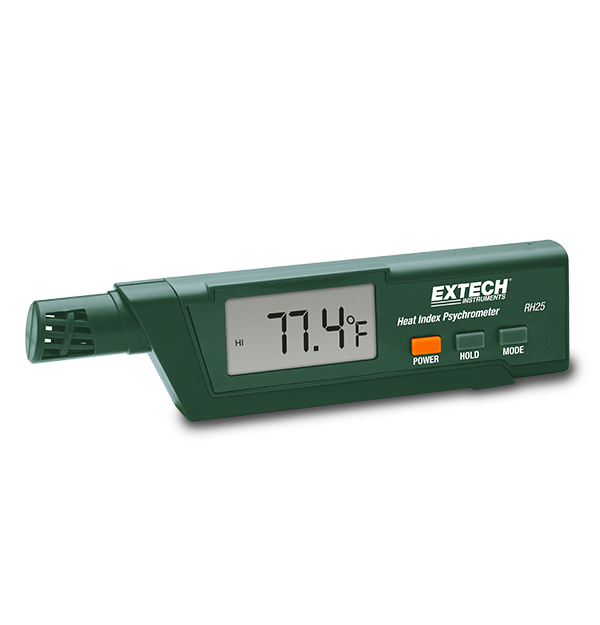 The Extech RH25 Heat Index Psychrometer pen easily monitors heat index during hot, humid days in helps to prevent heat stroke during outdoor activities or sporting events. Its pocket-sized design makes it convenient to carry it wherever you go. Complete with CR2032 battery.