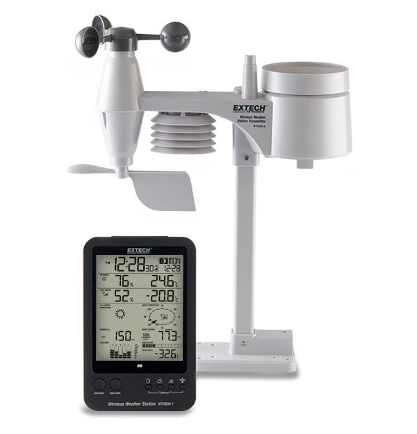 Extech’s Weather Station helps you plan your day to day outdoor activities that may be affected by weather conditions including businesses involved with construction, agriculture, and recreation. The Extech WTH600-E-KIT includes an indoor Wireless Base Station with a large LCD displaying indoor temperature, humidity, and outdoor weather conditions, plus date and time. It also comes with an outdoor Wireless Transmitter with 5 built-in sensors, including a self emptying rain collector for measuring rainfall, wind cups for wind speed, wind vane for wind direction, and temperature and humidity sensors. It sends data by a low power radio frequency to the Base Sation up to 150 m away. The kit comes assembled for easy installation.