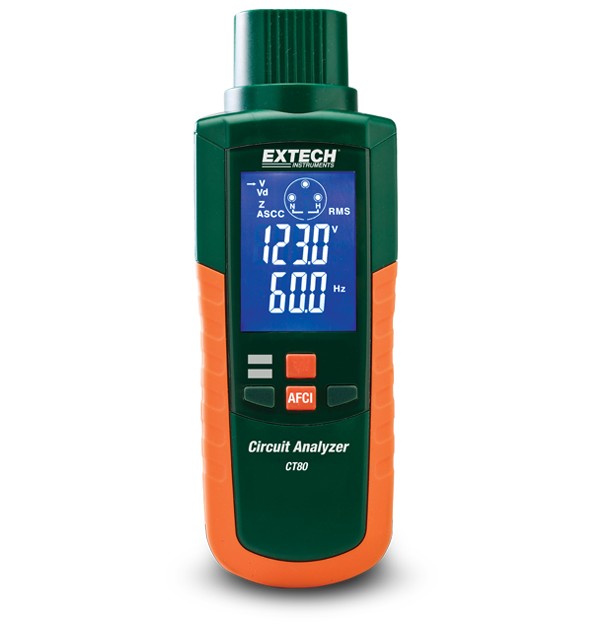 Circuit and wiring issues can introduce shock hazards and can compromise the performance of machinery and equipment. The Extech CT80 is a AFCI, GFCI, and AC Circuit Analyzer which covers outlet load handling and outlet tester functions. Complete with AC test cord (standard North American 3-prong plug).