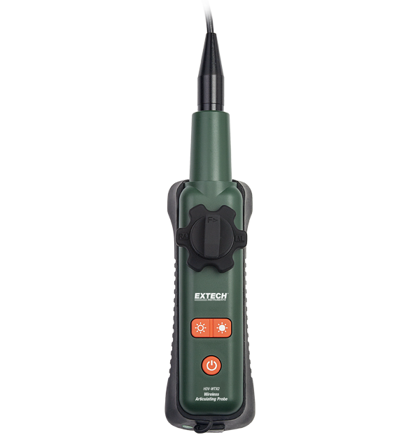 The Extech HDV-WTX2 is a semi-rigid probe (2 m) with 6 mm diameter camera and macro lens. The wireless videoscope camera has a 320° articulating tip for the best viewing angle. Easy one-hand operation of the articulating camera tip facilitates viewing in obstructed areas where standard camera tips are otherwise unable to access. A built-in wireless transmitter in the camera cable control allows you to transmit video up to 30.5 m from the measurement point to your monitor.
