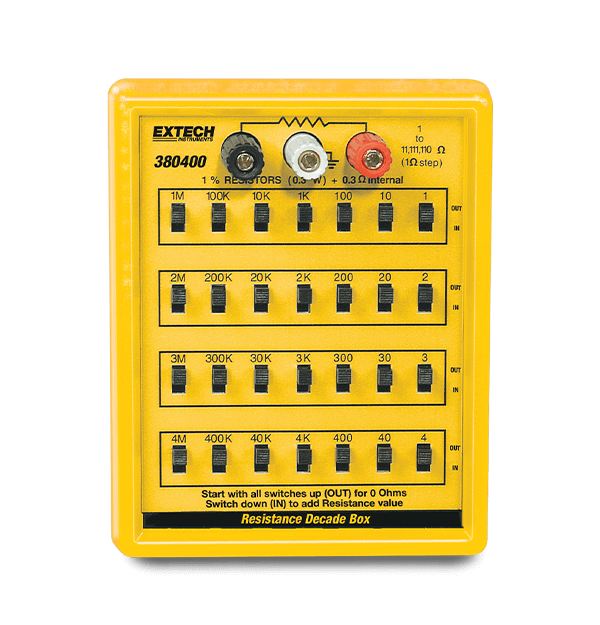 La caja de resistencia a décadas Extech 380400 es muy popular para las pruebas y la calibración de diseño de productos porque se puede sustituir fácilmente por un circuito y una función en lugar de cualquier componente con un valor estándar. Alternativamente, se puede utilizar para identificar el mejor valor para el funcionamiento del circuito y luego leer ese valor de los interruptores. Luego, se puede colocar en el circuito una resistencia del tamaño indicado por los interruptores de caja de resistencia a décadas.
