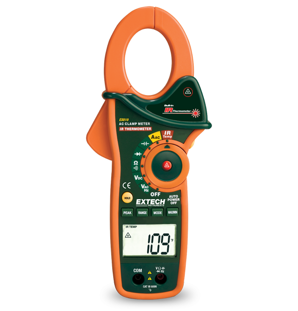 La pinza amperimétrica EX810 cuenta con un termómetro de IR incorporado con puntero láser para mediciones de superficie sin contacto de -50 a 270 grados centígrados (de -58 a 518 grados Fahrenheit). La pinza mide corriente alterna hasta 1000 amperios con una resolución máxima de 0,1 amperios. La mordaza de 1,7 pulg. se adapta a conductores de hasta 750 MCM. La retención de picos captura las corrientes de inserción del motor y otras sobretensiones. Funciones de retención de datos y apagado automático. Otras características incluyen voltaje CA/CC, resistencia, capacitancia y frecuencia. Incluye cables de prueba, pila de 9 voltios y estuche.