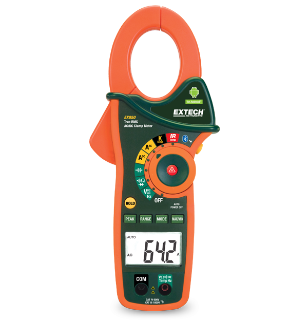 The Extech EX850 is a 1000 A True RMS AC/DC Clamp Meter with Bluetooth®, capable of transmitting key electrical readings to android mobile devices. The EX850 measures AC/DC current and voltage, resistance, capacitance, frequency, IR temperature, and continuity. This clamp meter has a 4.3 cm (1.7 in) jaw opening for conductors up to 750 MCM or two 500 MCM. The EX850 also has a 4000 count backlit LCD display, auto ranging and manual ranging button, as well as data hold, min/max, and auto power off functions. This product has a CAT IV 600 V safety rating and comes with CAT IV test leads, 9 V battery, general purpose Type K probe, user's manual, and pouch case.