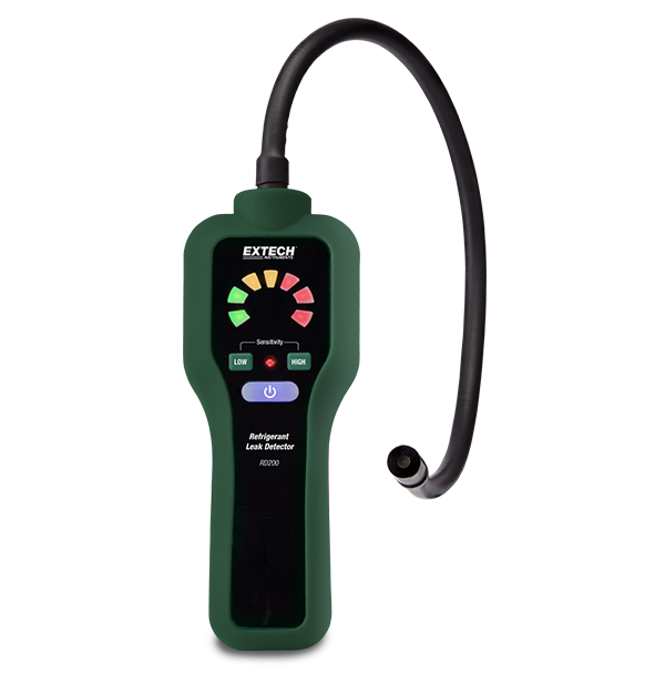 The Extech RD200 Refrigerant Leak Detector is easy to use and is ideal for detecting leaks from air-conditioning units and cooling systems that use all standard refrigerants. The multi-colored LED light bar indicates the level of refrigerant detected by the RD200. Features a field replaceable heated diode sensor and low/high sensitivity range selection for accurate leak detection. The 406 mm (16 in) flexible gooseneck provides easy access in difficult to reach locations.