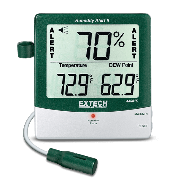 Este medidor de humedad con alarma y sonda remota cuenta con una pantalla triple grande de humedad relativa, temperatura y punto de rocío. Tiene un soporte integrado para colocarlo en un escritorio, pero también se puede montar en una pared con soporte incluido. Una alarma visual y audible advierte cuando el nivel de humedad supera o desciende por debajo del punto de ajuste ajustable. El medidor también almacena las lecturas máxima y mínima. La sonda remota se extiende 18 in para medir detrás de las paredes. Ideal para usar en áreas húmedas donde el moho puede convertirse en un problema. Incluye soporte integrado, soporte de montaje en pared y 2 baterías AAA.