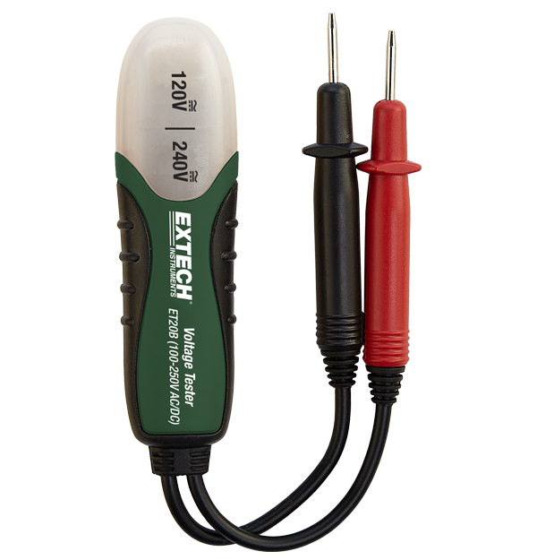 El Extech ET20B es un detector de voltaje de CA/CC de tamaño compacto (100-250 V CA/CC). Cuenta con un indicador de voltaje de luz de neón, cables de prueba integrados, clip de bolsillo y carcasa aislada.