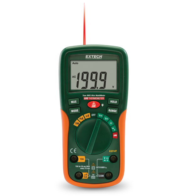 The Extech EX210T is a TrueRMS Digital Multimeter with IR. The meter auto ranges and has a 2000 count large LCD display. It measures AC/DC voltage and current, resistance, and temperature (IR). Its True RMS measurements make this meter more accurate and reliable when measuring distorted waveforms, and its built in IR thermometer has a 4:1 distance to target ratio, visually aided by the built in laser pointer. This meter has a CAT III 600 V safety rating and is complete with a year warranty, test leads, and a 9 V battery.