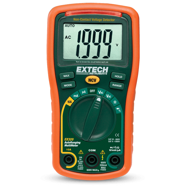 The Extech EX320, a compact auto ranging multimeter, features extra large 2000 count display and a built in, non-contact AC Voltage detector. Its large LCD display can display continuity, diode test, and max hold functions, as well as AC/DC voltage/current and resistance measurements. A rubber holster protects the meter. UL listed Cat III – 600 Volt. Includes test leads, two AA batteries, and a tilt stand.