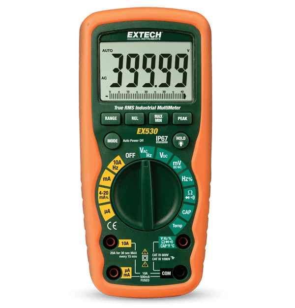 EX530, diseñado de forma robusta y resistente al agua según los estándares IP67, es ideal para su uso en exteriores, embarcaciones y en cualquier entorno industrial hostil. Tiene una carcasa de doble moldeado y es a prueba de caídas de hasta seis pies, con una clasificación de seguridad de CAT IV 600 voltios y CAT III 1000 voltios. Mide voltaje y corriente CA/CC, resistencia, capacitancia, frecuencia electrónica y eléctrica, temperatura, 4 a 20 mA y ciclo de trabajo. Las características adicionales incluyen precisión básica del 0.06 %, señal acústica de continuidad, prueba de diodos (voltaje de circuito abierto de 2.8 voltios), resoluciones de 40,000 conteos, LCD retroiluminada con barógrafo, retención de picos, mín./máx., modo relativo, retención de datos y protección de entrada de 1000 voltios para todas las funciones. Incluye cables de prueba de doble moldeado, sonda de temperatura de alambre de talón tipo K (de -4 a 482 °F/-20 a 250 °C), correa magnética para colgar, estuche y batería de 9 V.