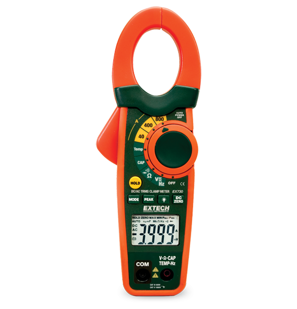 The Extech EX730 is an 800 A AC Clamp Meter with capacitance and frequency functions. It is capable of measuring AC/DC current and voltage, resistance, frequency, capacitance, temperature, diode, and continuity. The EX730 features double molded housing for better grip and one-handed operation, as well as a large LCD display with bright backlighting. The EX730 has a 30 mm (1.2 in) circular jaw opening for large cables (500 MCM) and comes complete with test leads, 9 V battery, Type K bead wire probe, and carrying case.