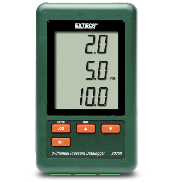 The Extech SD750 3-Channel Pressure Datalogger allows technicians to easily monitor and record pressure levels from three sources using one meter instead of three. Applications include pressure measurements from hydraulic, pneumatic, air compressor, and process gas systems, as well as other industrial applications. Complete with six AAA batteries, 2G SD card, universal AC adaptor, three connectors, and a mounting bracket.