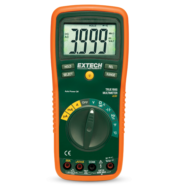 The Extech EX430 True RMS Autoranging Multimeter is a professional grade, True RMS Multimeter capable of performing a wide range of measurements. Functions include AC/DC voltage to 600 V, AC/DC current to 20 A, resistance to 40 M, continuity, and diode test. It also includes a Type K thermometer function for contact or air temperature measurements from -20°C to 750°C (-4°F to 1832°F). Advanced functions include capacitance, frequency, and duty cycle. The meter comes complete with test leads, Type K temperature probe, 9 V battery, protective holster, adjustable tilt stand, and velcro hanging strap.