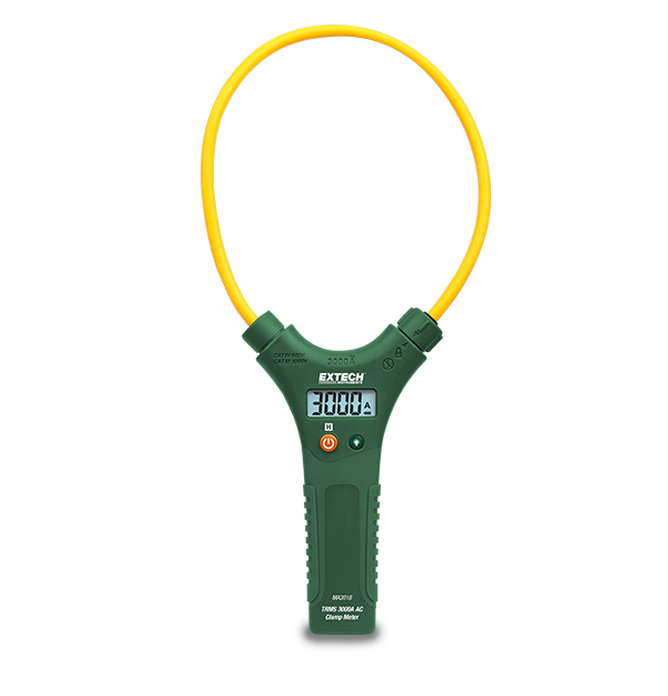 Le modèle Extech MA3018 est un multimètre à pince flexible CA 3 000 A à moyenne efficace (quadratique) vraie. Le MA3018 est doté d’une pince flexible de 45,7 cm (18 po) avec moniteur ACL. Les mesures à moyenne efficace (quadratique) vraie fournissent des relevés précis des formes d’onde bruyantes, déformées ou non sinusoïdales. Comprend 2 piles AAA. Homologué UL avec une cote de sécurité CAT IV 600 V.