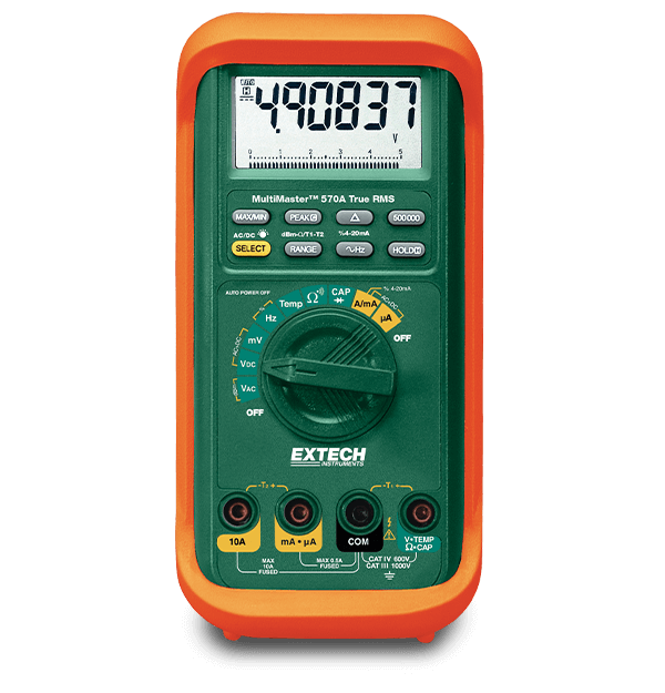 The Extech MM570A is a High-Accuracy Multimeter with 0.02% basic DCV accuracy and up to 100 kHz True RMS ACV bandwidth. The MM570A has special True RMS combination AC/DC function for measurements of rectified AC (non-symmetrical) voltage and current waveforms. Features include 4 mA to 20 mA readings, displayed as 0-100% for process current measurements. Like other quality multimeters, it includes functions like dual Type K temperature inputs, capacitance, frequency, resistance, continuity, duty cycle, and diode tests. with. Additionally it has min/max recording with auto ranging, auto power off, relative, hold, and a peak function which captures transient pulses. Optional Windows® compatible PC communication software and optically isolated cable. Complete with test leads, temperature probe, protective holster with stand, and 9 V battery.