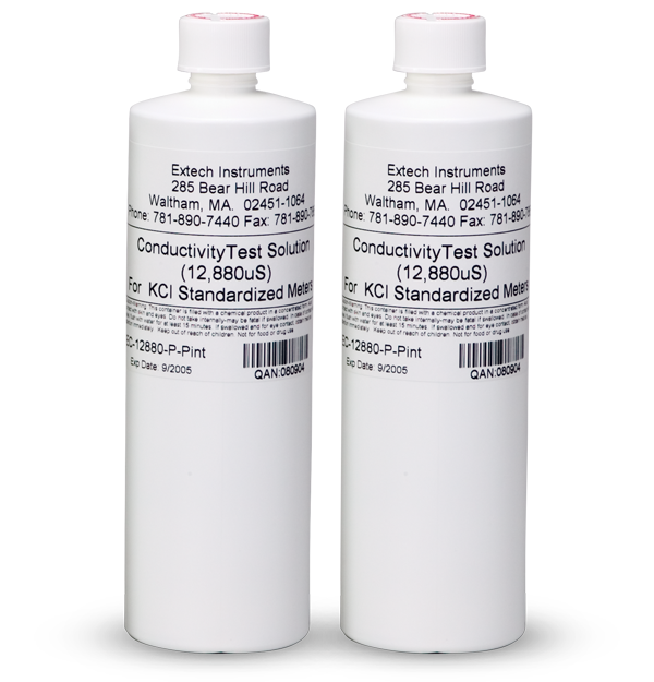 L’Extech EC-12880-P comprend deux flacons d’étalon de conductivité standard de 12 880 µS, 1/2 l chacun de solution préfabriquée. L’EC-12880-P est destiné à être utilisé avec les conductimètres tels que le conductimètre/l’appareil de mesure des solides dissous TDS/l’appareil de mesure de la salinité EC400 ExStik ou le kit de mesure d’oxygène dissous/de pH/de conductivité DO610 ExStik II.