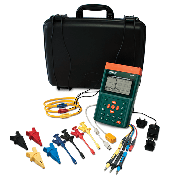Le modèle Extech PQ3350-1 est un analyseur triphasé de la puissance et des harmoniques capable d’afficher jusqu’à 52 428 mesures monophasées ou 17 476 mesures triphasées. Il comprend un grand affichage LCD rétro-éclairé affichant jusqu’à 35 paramètres sur un seul écran et permet l’affichage simultané des harmoniques et des ondes. Pour les systèmes monophasés et triphasés/3 fils ou triphasés/4 fils. Fourni avec 3 pinces ampèremétriques souples, 4 fils de tensions avec des pinces crocodile et des agrafes rétractables par plongeur, 8 piles AA, un adaptateur CA universel, un logiciel, un câble d’interface USB et une mallette de transport.