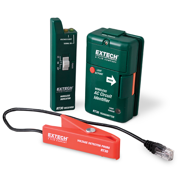 Le modèle polyvalent Extech RT30 utilise un émetteur de détecteur de tension sans contact de la taille d’un téléavertisseur qui se fixe sur le câblage en cours de fonctionnement et transmet un signal de « tension présente » à un récepteur de poche porté par l’utilisateur. Fixé sur un câble sous tension, l’émetteur envoie à l’utilisateur opérant au niveau du disjoncteur des signaux LED et sonores sur le récepteur (portée jusqu’à 100 m). Les alertes cessent lorsque le bon disjoncteur est éteint et que les travaux peuvent être réalisés en toute sécurité. L’émetteur et le récepteur de l’identificateur de circuit CA sans fil RT30 sont fournis avec une sonde de type pince à distance, 4 piles AAA, une pochette et des instructions d’utilisation. Les États-Unis, le Mexique et le Canada utilisent le modèle 914 MHz et la majorité des autres pays utilisent le modèle 869 MHz.