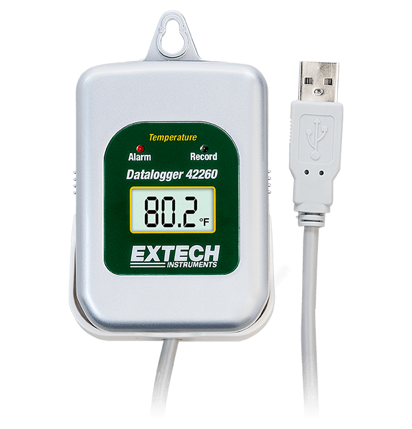 The Extech 42265 is a Temperature Datalogger Kit with PC Interface. This waterproof (IP65) datalogging kit records up to 8000 readings with a date and time stamp that can be downloaded to your PC for analysis. Temperature can be viewed on the datalogger's display. Data and additional dataloggers (42260) can be programmed from one docking station. It has a wide operating temperature range from -40°C to 85°C (-40°F to 185°F), as well as a programmable sampling rate from one second to two hours plus hi/lo limits with an alarm indication. Comes complete with docking station, software, and one 42260 datalogger with Li-Ion battery.