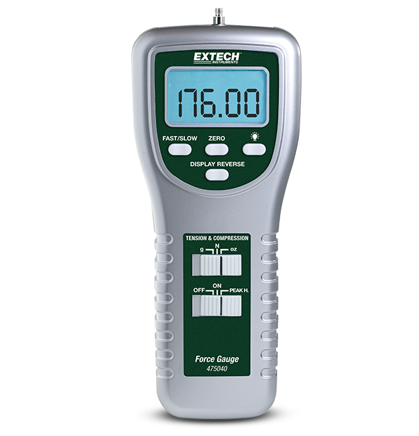 475040 è un dinamometro digitale con display LCD a 5 cifre e mantenimento del picco. Esclusivo trasduttore di misurazione con cella di carico. Indicazioni di sovragamma, batteria scarica e indicatore di funzione avanzato. Capacità di misurazione 5 kg/176 oz/49 Newton. Precisione di base dello 0,4%. Comprende asta di tensione, custodia per il trasporto, 4 adattatori (testa piatta, a cono, a scalpello e gancio per la tensione) e 6 batterie AA.